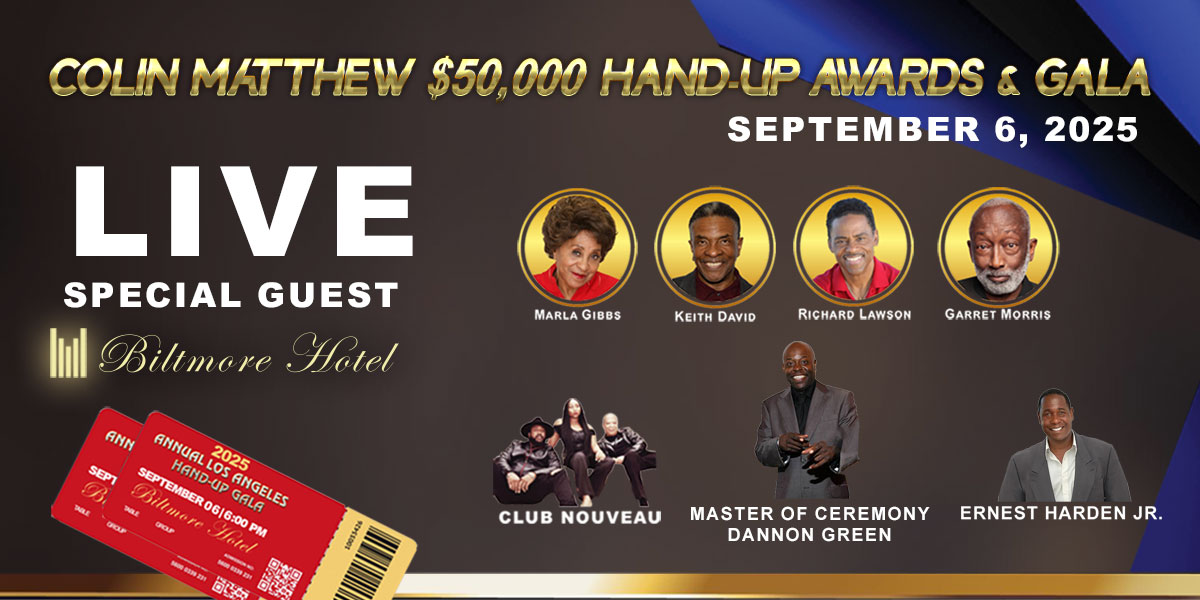 Annual 2025 Colin Matthew $50,000 Hand-Up Awards and Gala, an evening dedicated to celebrating and supporting underserved adults and children with special needs. Join us at the Los Angeles Biltmore Hotel for a night of celebration, dinner and entertainment. This year’s honorees and guests include Marla Gibbs, Keith David, Garret Morris, Richard Lawson, Ernest Harden Jr. and Host Dannon Green. With special performance by the musical guest, Club Neuveo.
